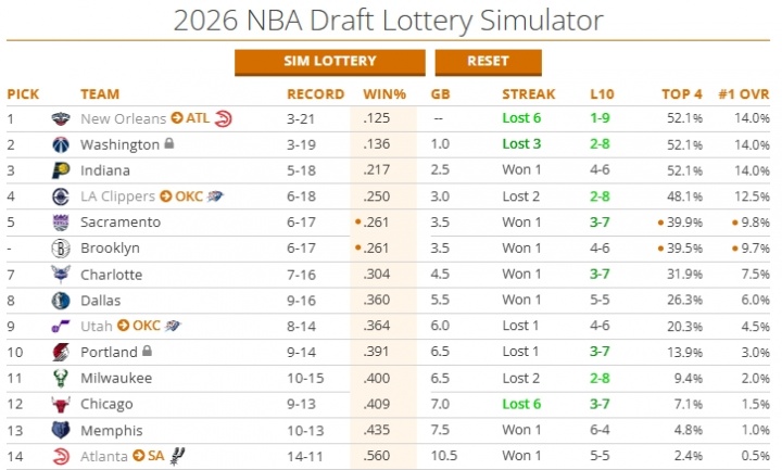 这样,快船明年的首轮签前四概率来到48.1%,状元签概率是12.5%。